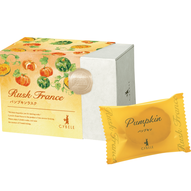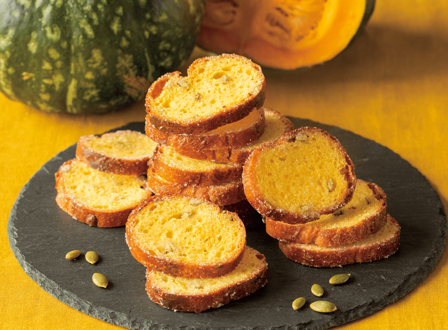生地にはパンプキンを練り込むだけでなく、栄養価の高いパンプキンシード(種)も入れました。サクサクのラスクの中に、カリッとしたパンプキンシードは食感のアクセントに。