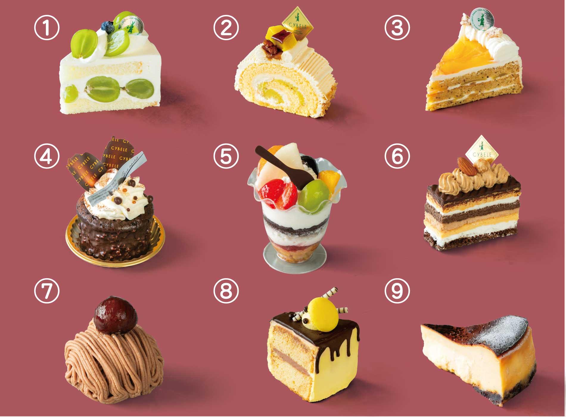 ①シャインマスカットショート ④モン・ショコラ ⑤フルーツパフェ ⑦モンブラン