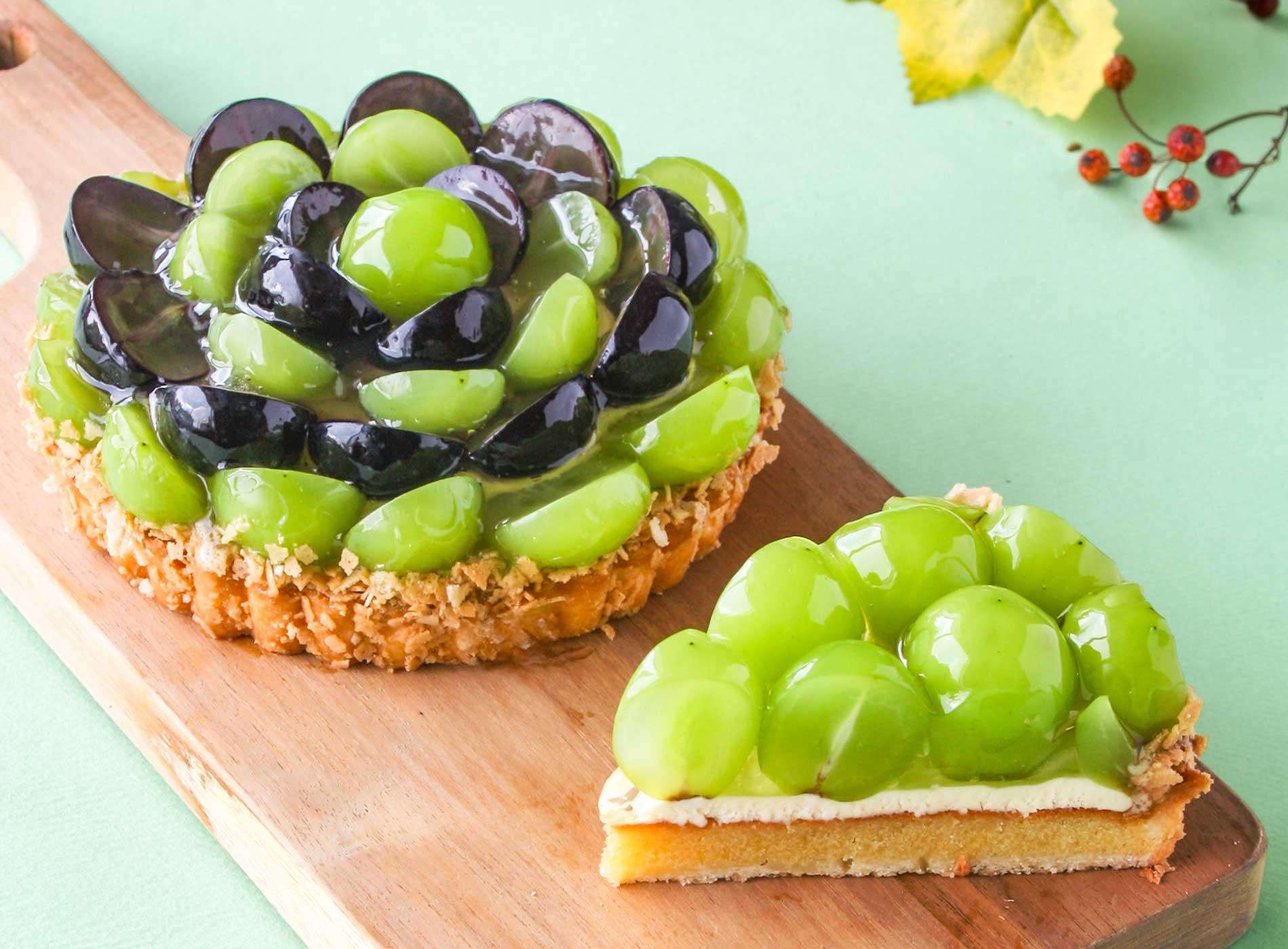 香ばしいアーモンドタルトに滑らかなマスカルポーネクリームと旬のマスカットを丸ごと飾りました。