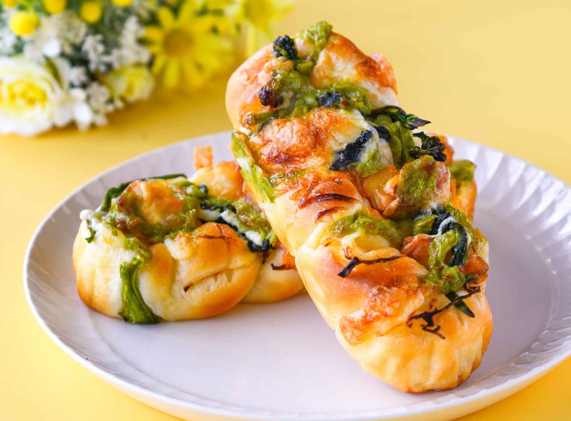 新玉ねぎ・じゃがいも・菜の花をのせて春色に焼きあげた彩り野菜パン。やさしい味わいで春を感じる一品。